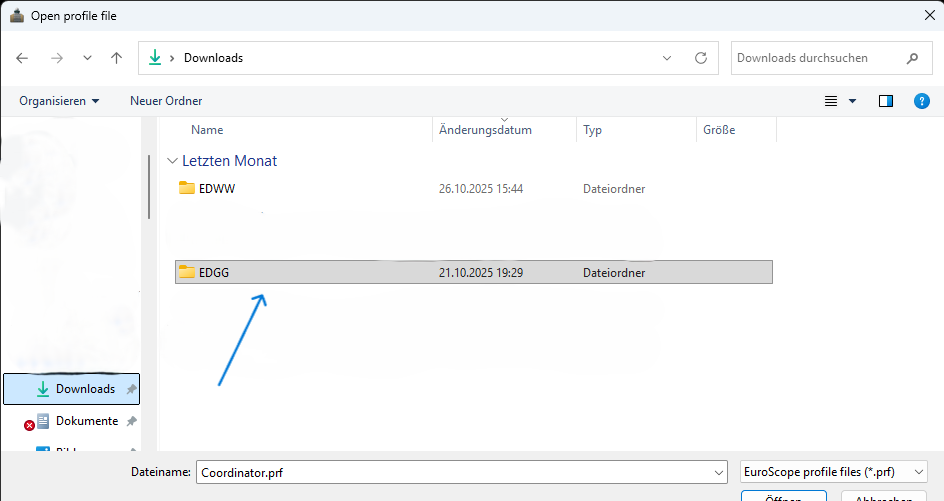4. Now, in the Window in EuroScope, look up in the folder where you extracted the .zip file (most times on Windows, it´s the ,,Downloads" folder).